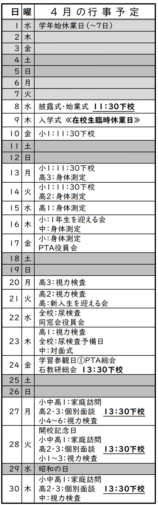 | 入学式・卒業式 | 児童生徒作品展 | 同窓会 | 始業式・終業式 | |||