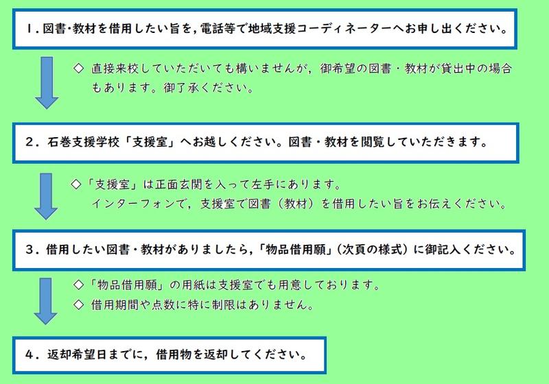 ①教材借用までの流れについて、詳しくはこちらを御覧ください。・・・・・・・図書・教材の借用までの流れ .pdf